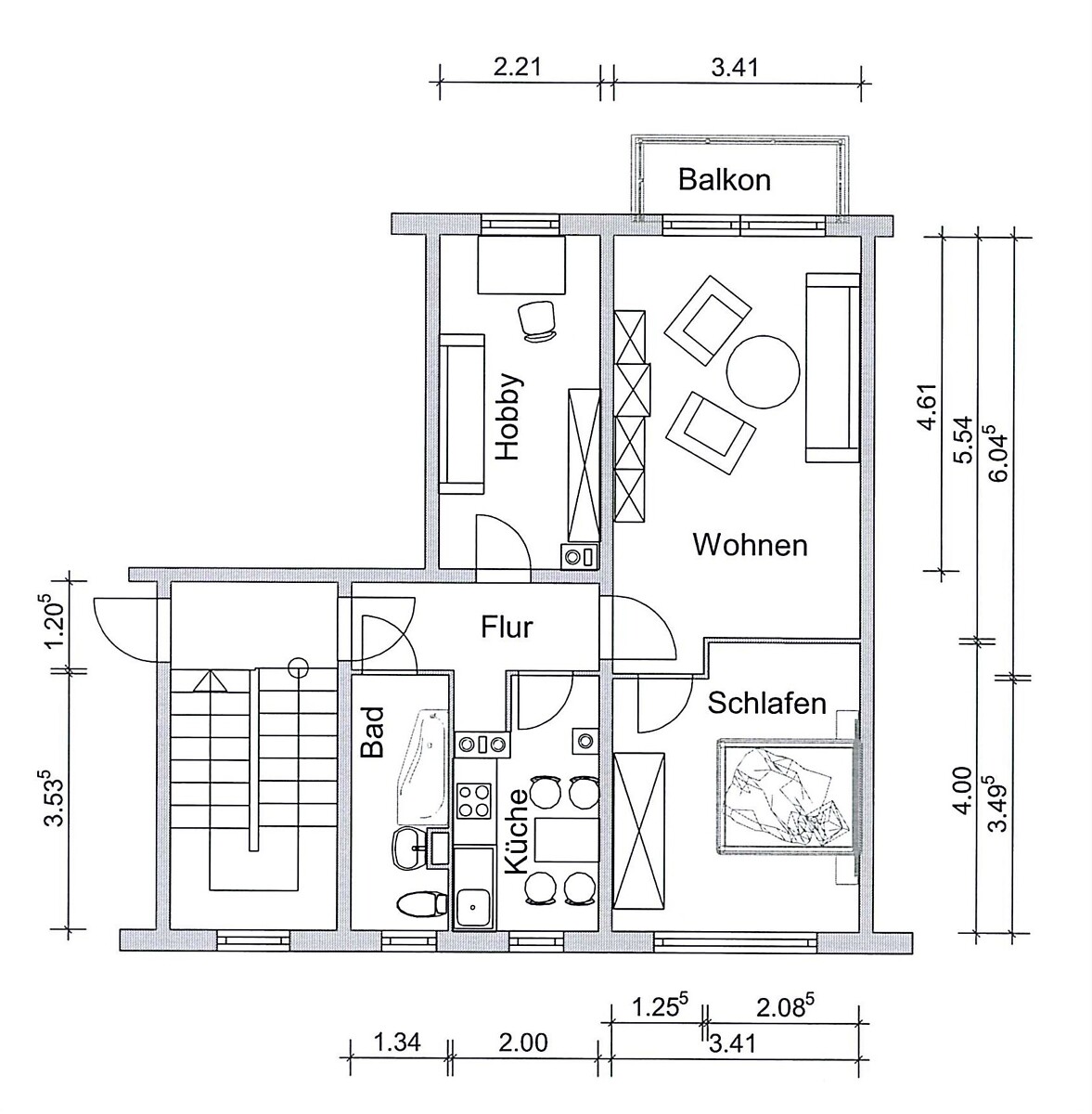 Wohnzimmer mit Balkonzugang, Schlafzimmer, Kinderzimmer, Küche sowie ein Tageslichtbad mit Badewanne.